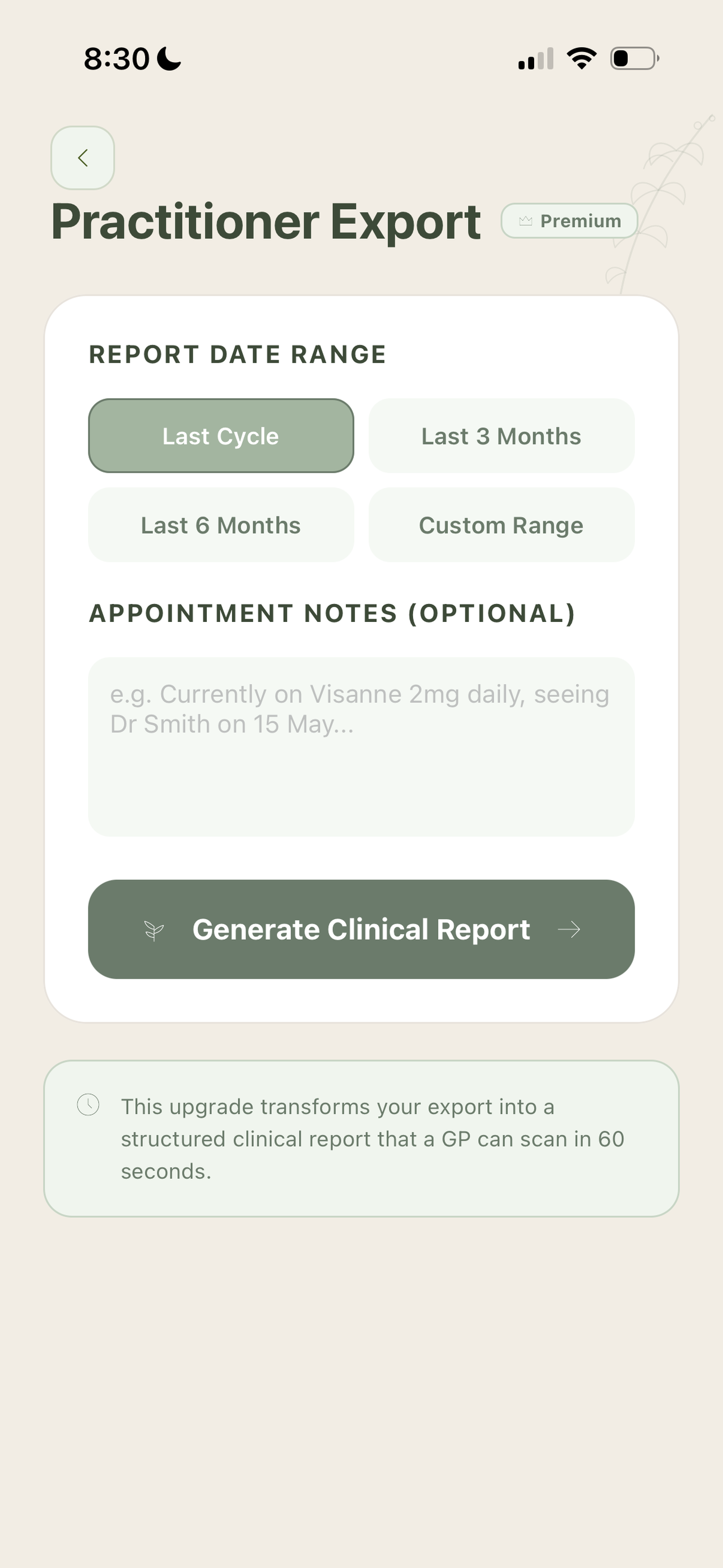 Generate a clean, dated symptom report to bring to your GP or specialist. Arrive prepared and be taken seriously.