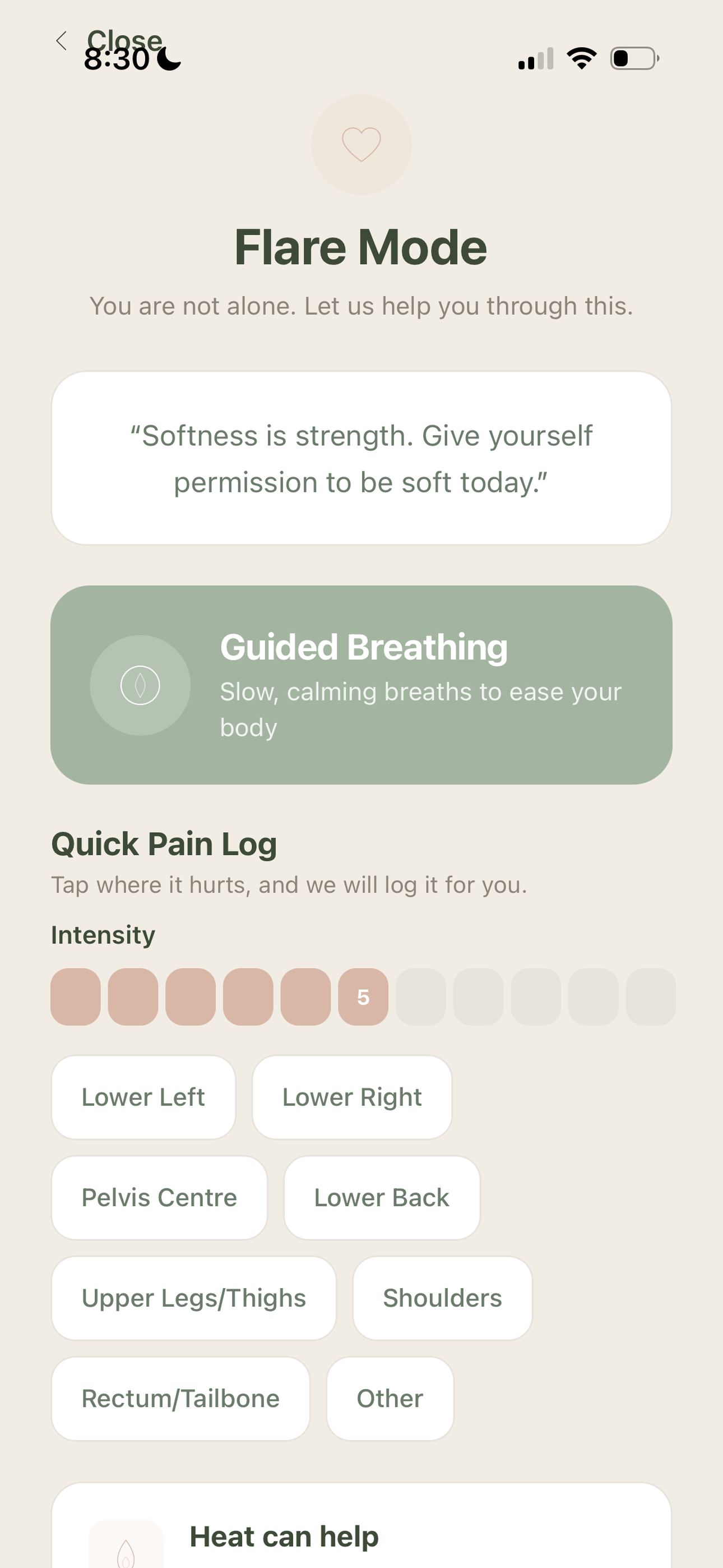 When symptoms spike, activate Flare Mode for immediate naturopathic support and quick logging in under a minute.